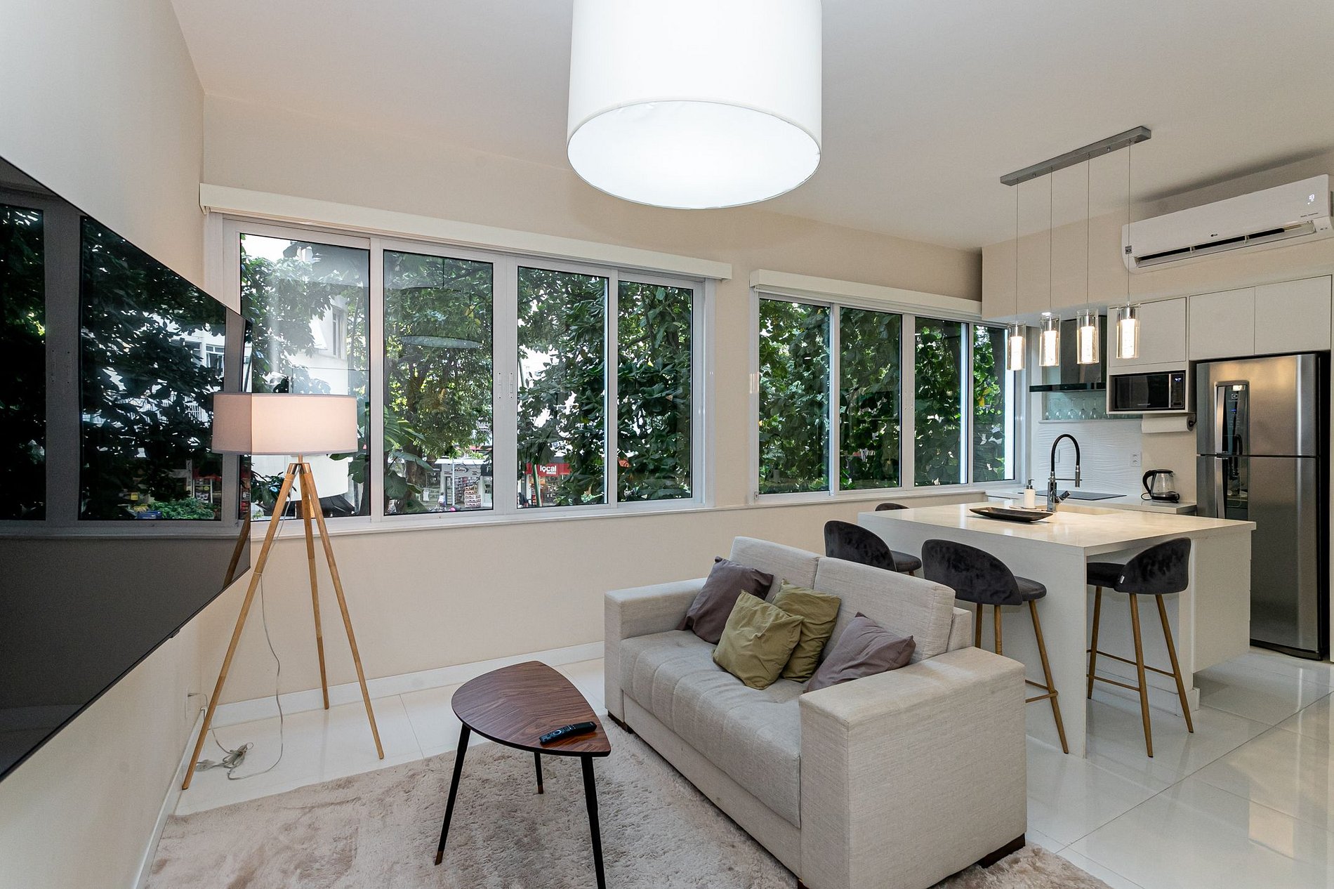 You'll enjoy all the amenities you need for a comfortable and convenient stay, including air conditioning, Wi-Fi, and a fully equipped kitchen where you can whip up your favorite Brazilian meals. Relax in the cozy living room, complete with a comfortable sofa and chairs, a flat-screen TV, and beautiful decor.
