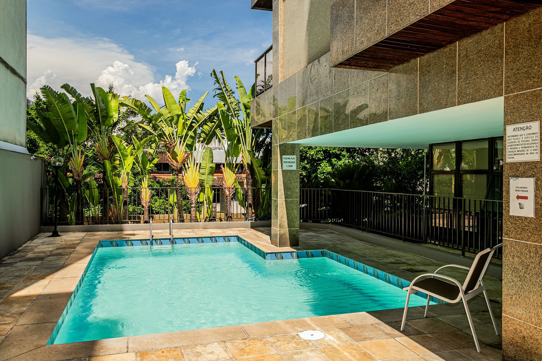 Tem um quarto (suíte) com cama queen. Sala com varanda e cozinha totalmente equipada. Serviço diário de arrumação. O prédio tem uma lavanderia que você pode usar recebendo moedas na recepção, assim como sauna, piscina e academia!