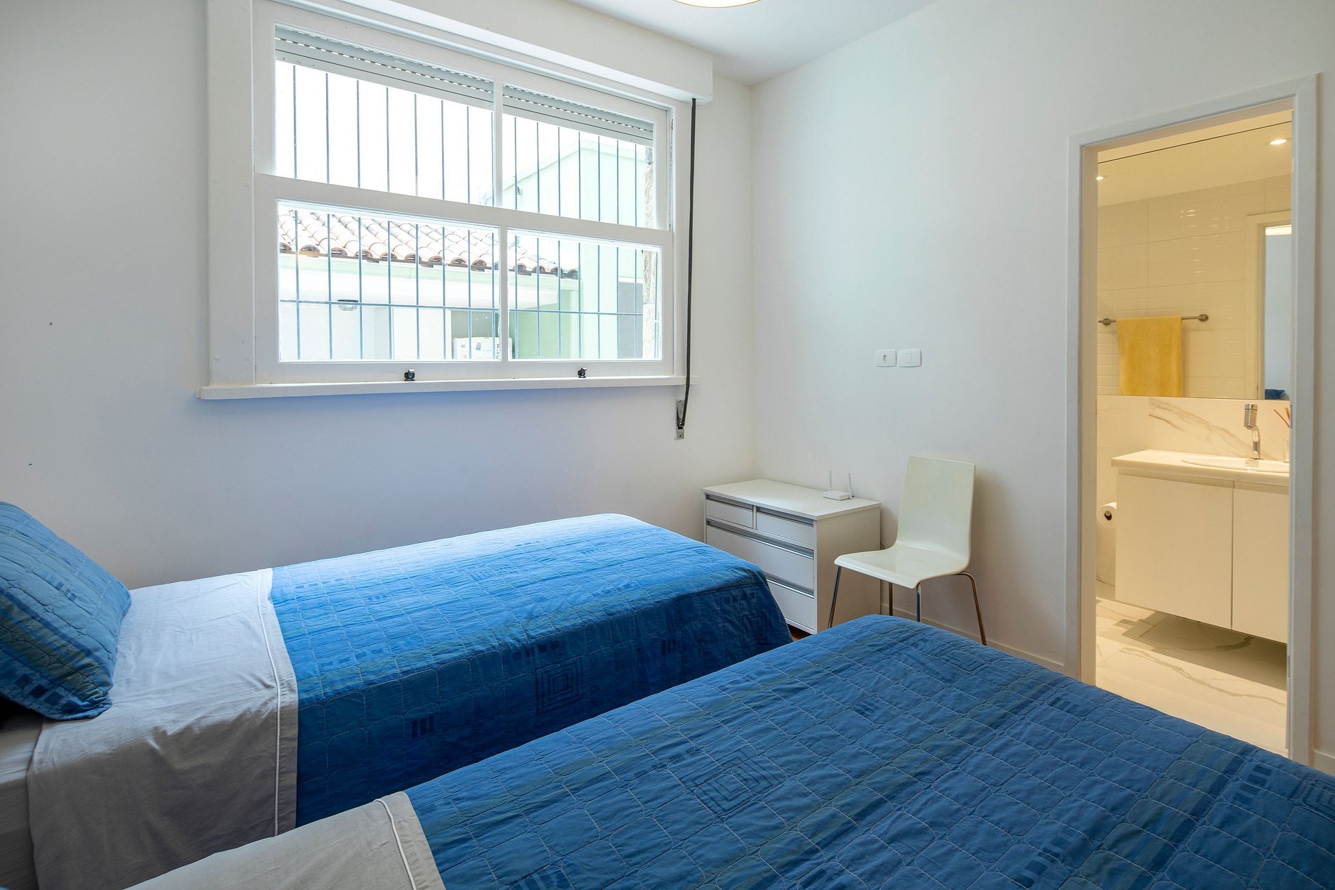 O 3º quarto é semelhante ao 2º e possui 2 camas de solteiro/cama queen-size, cortinas blackout e guarda-roupa. O banheiro também é limpo, espaçoso e cheio de luz.
