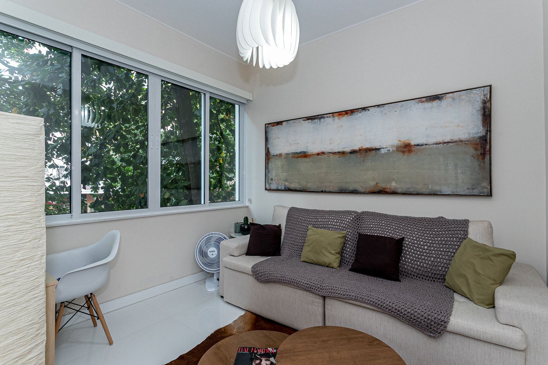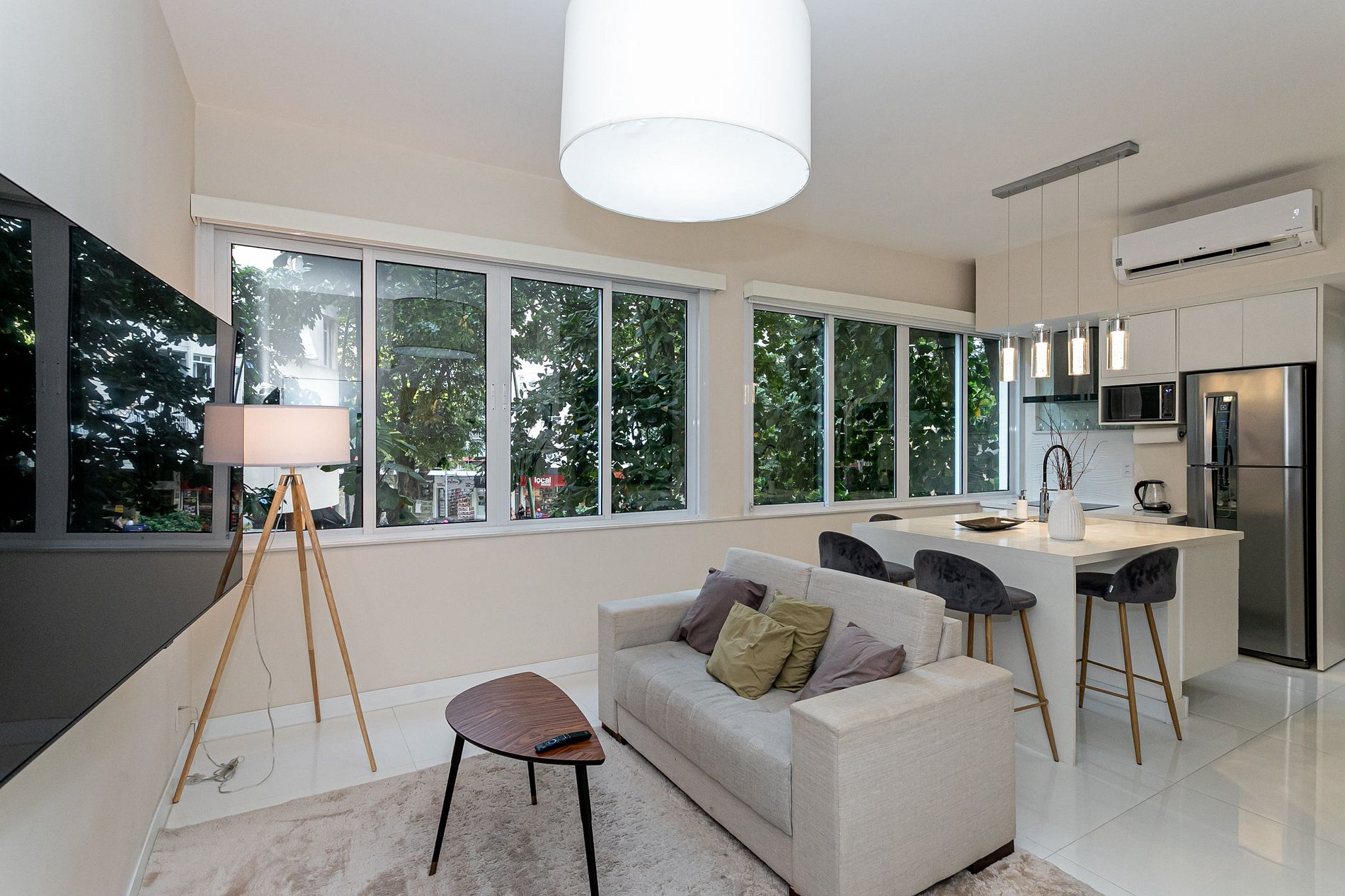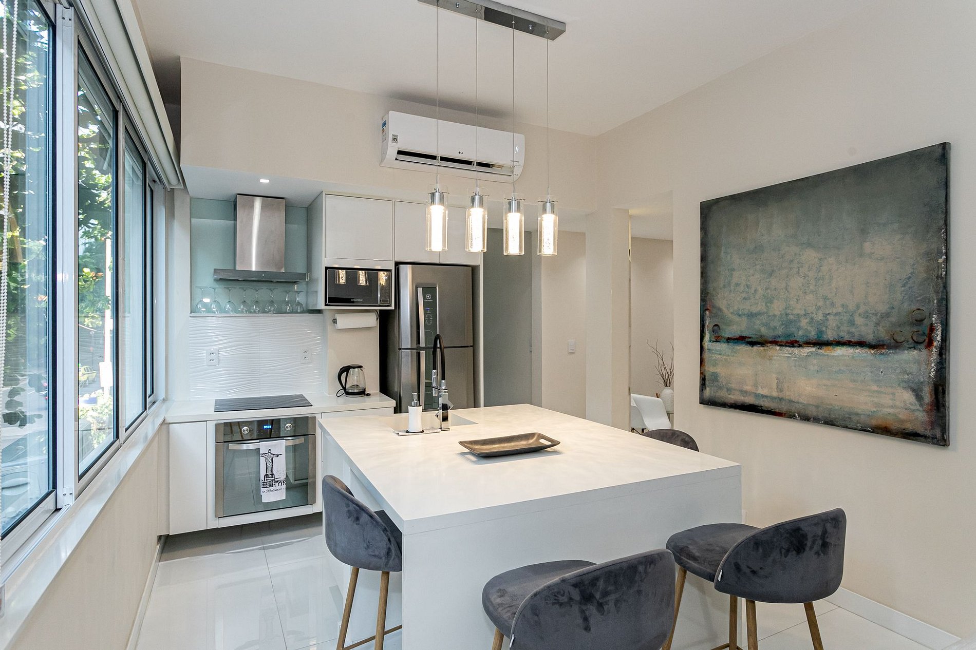 You'll enjoy all the amenities you need for a comfortable and convenient stay, including air conditioning, Wi-Fi, and a fully equipped kitchen where you can whip up your favorite Brazilian meals. Relax in the cozy living room, complete with a comfortable sofa and chairs, a flat-screen TV, and beautiful decor.