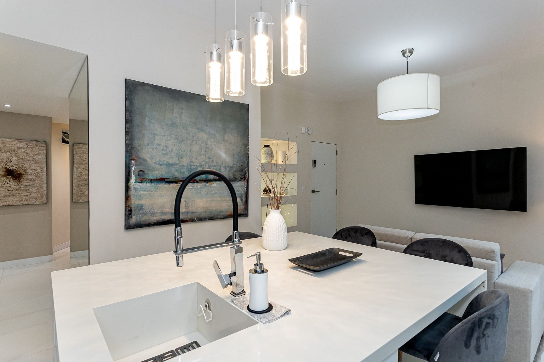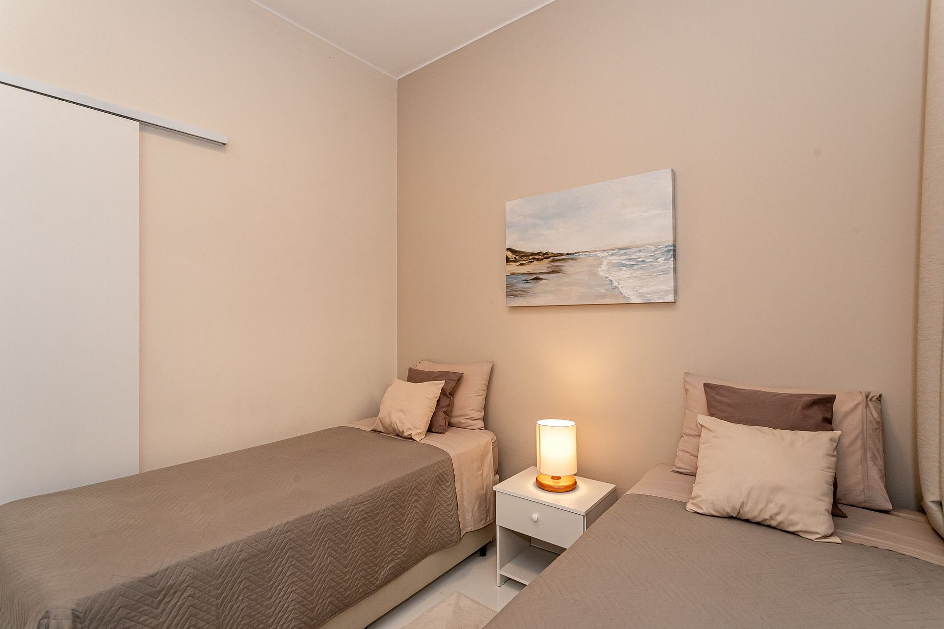 Inside, you'll find a master bedroom suite with a comfortable double bed, en-suite bathroom, and plenty of closet space. The second bedroom features two twin beds, perfect for families or friends traveling together. The apartment is newly renovated, with sleek and contemporary furnishings that create a welcoming and relaxing atmosphere.